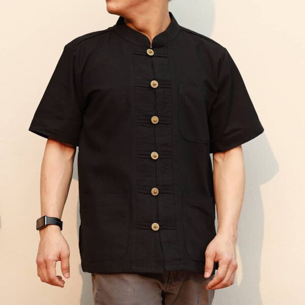41003 เสื้อผ้าฝ้ายชายสีดำ เนื้อผ้าชินมัย ตองชัย กระดุมเหรียญ แขนสั้น