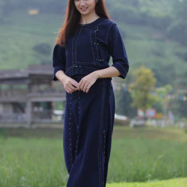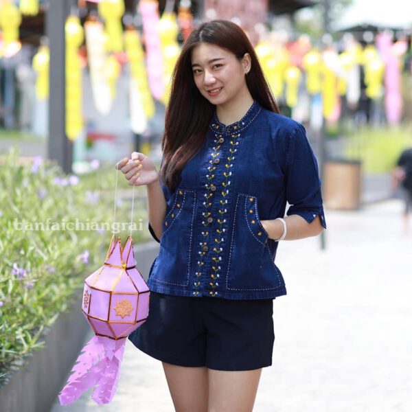 23007 เสื้อผ้าฝ้ายพื้นเมืองผู้หญิง แต่งแผ่นปักมือชาวเขา สีกรม