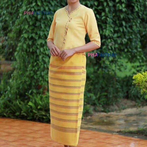 60033 เสื้อผ้าฝ้ายพื้นเมืองผู้หญิง ทรงป้าย กระดุมแถบ สีเหลือง