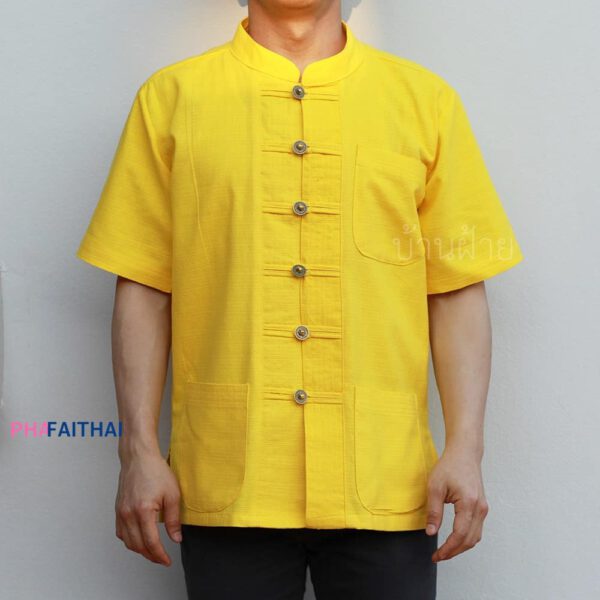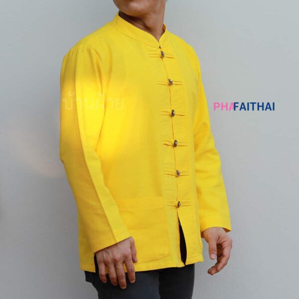 11112 เสื้อผ้าฝ้ายผู้ชาย เนื้อดี คอจีนกระดุมจีน แขนยาว สีเหลือง