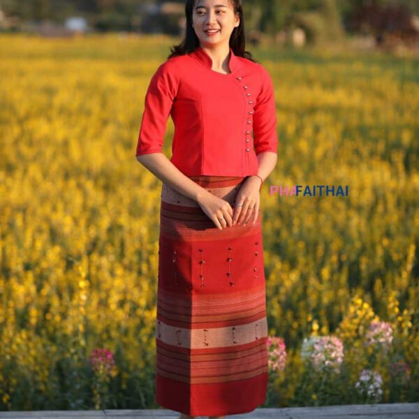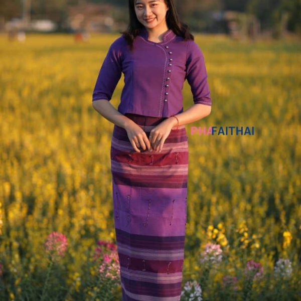 23007 เสื้อผ้าฝ้ายพื้นเมืองผู้หญิง แต่งแผ่นปักมือชาวเขา สีกรม
