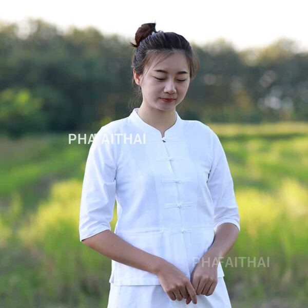 320.00 ฿50531 เสื้อพื้นเมืองหญิง เสื้อคอจีนกระเป๋าเจาะ สีขาว