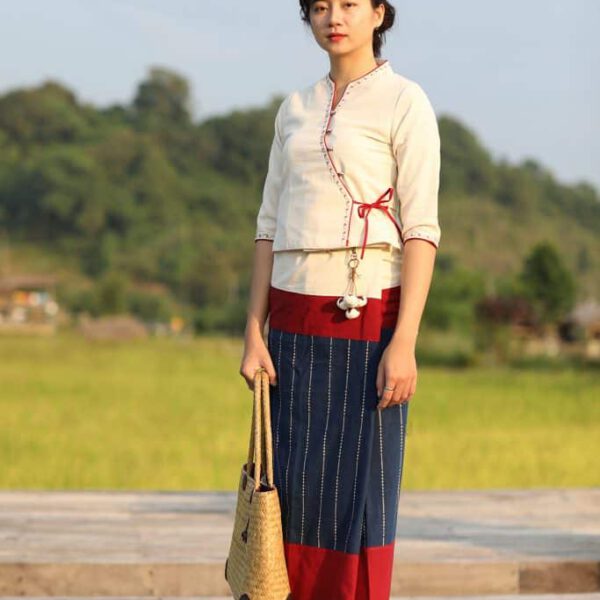 - เสื้อผ้าม่อฮ่อมผู้หญิง ทรงเข้ารูป ป้ายผูกข้าง ขอบสีแดง